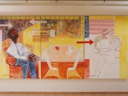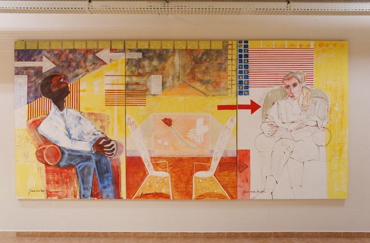 A obra apresentada na imagem é o mural tripartido "A SALA DE ESPERA", do artista plástico Adilson Guanabara. O painel é composto por três partes que representam um homem sentado em uma cadeira vermelha à esquerda, uma mesa central com um par de luvas brancas e um botão de rosa vermelho simbolizando a relação entre razão e sentimento na medicina, e um desenho a lápis de uma mulher sentada à direita, representando o conhecimento em construção. A obra utiliza uma paleta de amarelo, vermelho e branco, com elementos geométricos e texturas, explorando temas ligados à medicina e à espera.